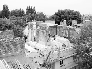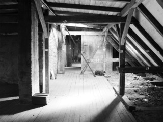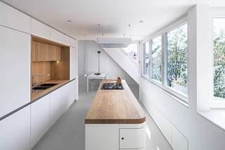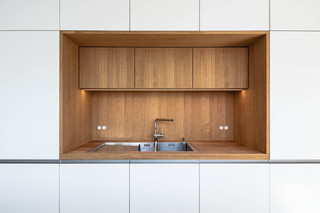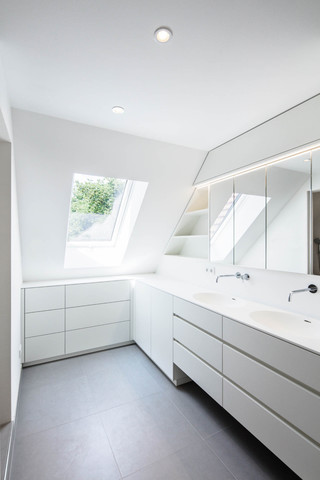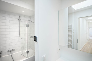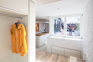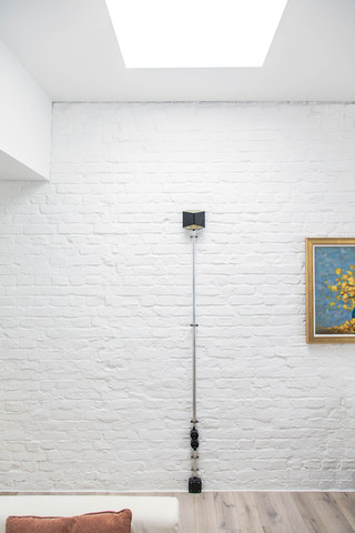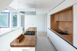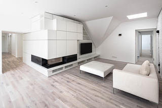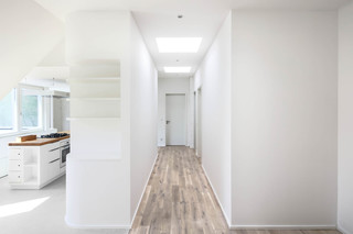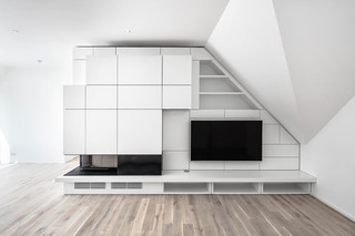 Die Wohnung wurde im Bereich zur Gebäudemitte hin gezielt mit zusätzlichen Oberlichtern versehen, damit die unterschiedlichen Raumabfolgen möglichst viel Tageslicht erhalten. Das Mauerwerk der Giebelwände und der Schornsteine wurde nicht eingeputzt, sondern gesäubert, ausgebessert und anschließend geweißt. Es bildet, gemeinsam mit den kontrastierend glatten Flächen der übrigen Wände und den zahlreich vorhandenen, ebenfalls weißen Einbaumöbeln, ein an vielen Stellen der Wohnung wiederkehrendes Motiv. Auf dem Sichtmauerwerk wurde die Elektro-Installation dann in klassischer Aufputz-Verlegung mit Hüllrohr und Bakelitschaltern ausgeführt. Der Boden besteht in den Haupträumen aus massiven, weiß geölten Eichendielen. Stahlbauteile, wie die Treppen und Geländerdetails, wurden individuell geplant. Das gilt ebenso für die unterschiedlichen Einbaumöbel, wie etwa der Küche und dem großen Kamin- und Mediamöbel im Wohnzimmer.