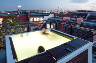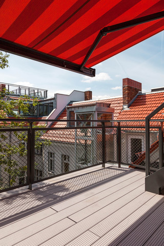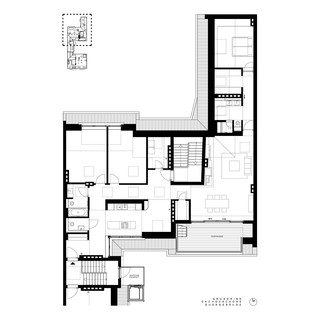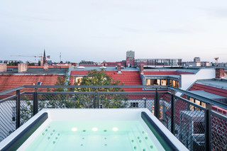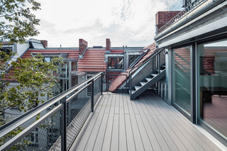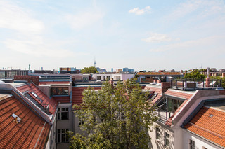 Per neugebautem Aufzug geht es vom Hof aus zur Dachwohnung im hinteren Teil des Gebäudes. Oben ein kleines Entree mit Garderobe, Schuhbank und WC-Box. Von hieraus erhält man einen ersten Blick auf die umliegende Dachlandschaft. Gleich dahinter folgt ein Bereich mit geringerer Raumhöhe, der eine halboffene Küche samt Essecke aufnimmt. Man kann nun die Abkürzung durch die Küche nehmen, oder einfach geradeaus weiter gehen, in Richtung des Kinderbades und der beiden Kinderzimmern. Der Flur gewinnt dann wieder deutlich an Höhe, zudem wurde er mit Oberlichtern versehen, die ihn mit Tageslicht versorgen. Nun, an einer kleinen Kreuzung angelangt - links befindet sich der Technik- und Hauswirtschaftsraum, rechts die Essecke mit der Küche - gelangt man durch eine Art kleinen Torgang in das Ess- und Wohnzimmer mit der vorgelagerten Terrasse. Hier befindet sich ein um die Ecke herumgezogenes, raumprägendes Einbaumöbel, in das neben einem Kamin, auch ein TV- und Soundsystem integriert wurde. Über den Außenbereich der Terrasse geht es jetzt weiter über eine Treppe die zur Aufdachterrasse führt. Oben erlangt man einen 360°-Blick über die Dächer Friedrichhains. Man kann hier die Abendstunden im Berliner Panorama verbringen, am besten im Whirlpool, der bis zu vier Leuten Platz bietet. Wieder unten angelangt, am Ende des Wohnzimmers, befindet sich noch eine weitere Tür. Dahinter beginnt der private Bereich der Wohnung mit Elternbad, Ankleide und schließlich dem Schlafzimmer. Hier hinten, im Innersten des gesamten Baublocks, ist es vor allem leise, man hört nicht viel mehr, als das Rauschen der Bäume.