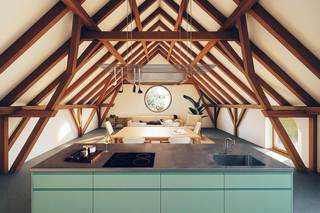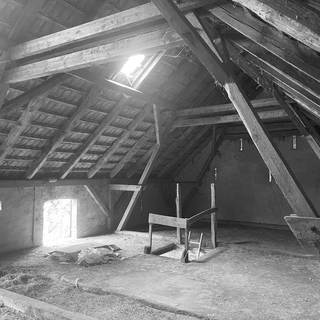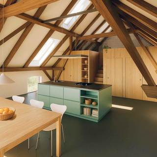 Es wurde ein Konzept entwickelt, dass die äußere Gestalt des um 1914 gebauten Stalls weitestgehend unverändert lässt und im Dachgeschoss, das ursprünglich als Heuboden genutzt wurde, einen großen zusammenhängenden Wohnraum vorsieht, der die bestehende Holzkonstruktion des Dachstuhls sichtbar belässt. Ein einziger möbelartiger Einbau an der östlichen Giebelseite nimmt neben der Treppe aus dem Erdgeschoss, ein separates Schlafzimmer und ein Bad auf, gleichzeig entsteht darauf eine Art Empore, die weiteren Schlafplatz bietet.