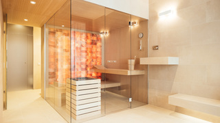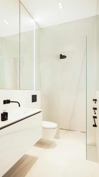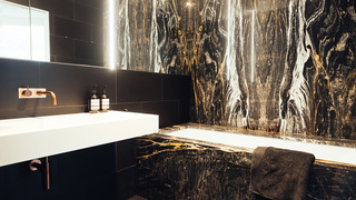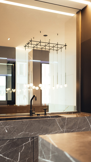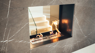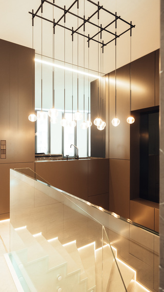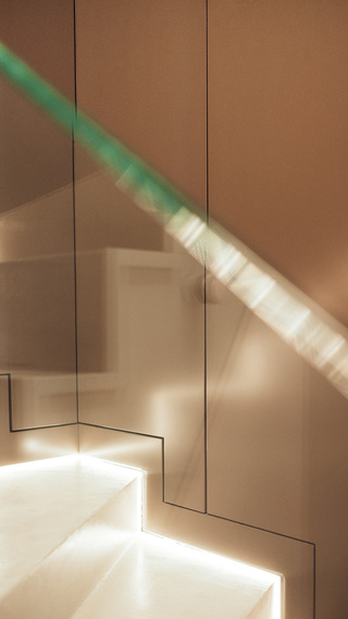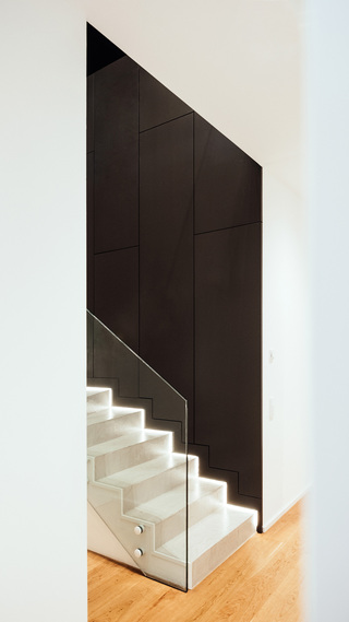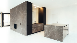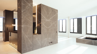 Hochwertiger Ausbau einer Maisonettewohnung in Berlin-Mitte. Die mit Naturstein verkleidete Innentreppe des zentralen Wohnraums nimmt dabei verschiedene Funktionen wie Kamin und Küche auf.