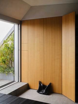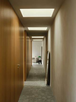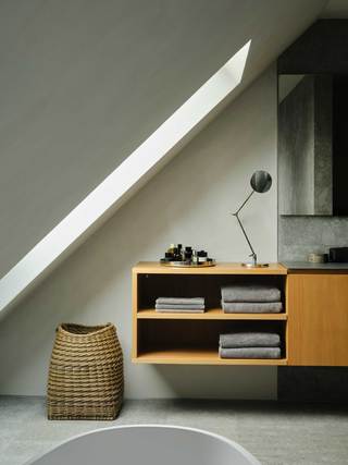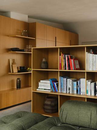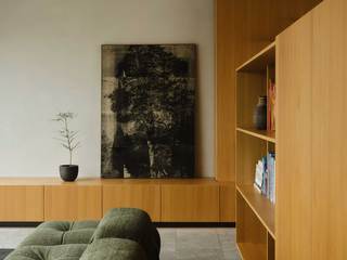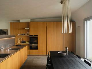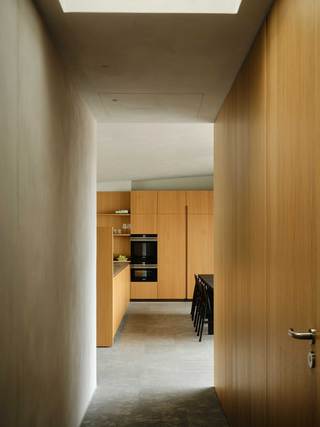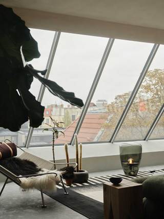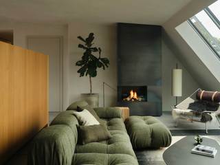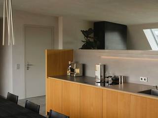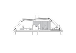 Der große durchgesteckte Raum, über den die Wohnung betreten wird, ist in der bauzeitlich typischen Form eines „Berliner Daches“ ausgebildet und wird durch ein freistehendes, halbhohes Einbaumöbel in einzelne Nutzungsbereiche unterteilt. Dieses zentrale Element der Wohnung, nimmt in sich gleich mehrere Funktionen, wie Garderobe, Bücheregale und die Küche auf. Zur Seite der Terrasse hin befindet sich hier ein offener Kochbereich mit Essplatz, gegenüberliegend davon, der Wohnbereich mit Kamin und einem in der Schrägdachebene integrierten Panoramafenster.