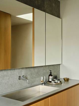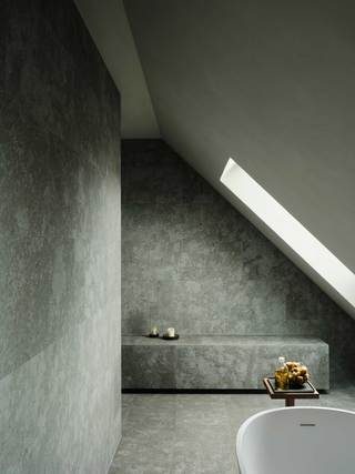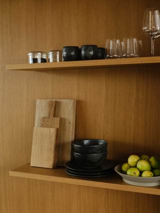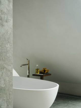 Die Böden der gesamten Wohnung bestehen aus mit gestockter Oberfläche versehenden Nagelfluh, einem heimisch vorkommenden Naturstein. Wände und Decken wurden mit einem atmungsaktiven Lehmputz versehen, bzw. mit Lehm gespachtelt. Die Oberflächen sämtlicher Einbaumöbel bestehen aus geölter Eiche und Edelstahl.