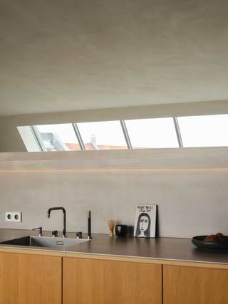 Die hier gezeigte Wohnung 1 besteht aus einer großen Wohnküche mit vorgelagerter Dachterrasse und einem privateren Teil, der Schlafräume und Bäder aufnimmt.